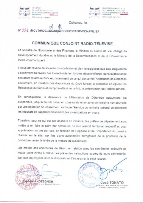 Politique & Société Gestion foncière au Benin : l’Attestation de détention coutumière ne sera plus délivrée Dans un communiqué radio-télévisé, le gouvernement béninois a suspendu la délivrance de l'Attestation de Détention Coutumière (ADC) dans les zones rurales et périurbaines non couvertes par une opération de lotissement. Adjatchè News22 mars 2024232,0 LecturesLire l'article