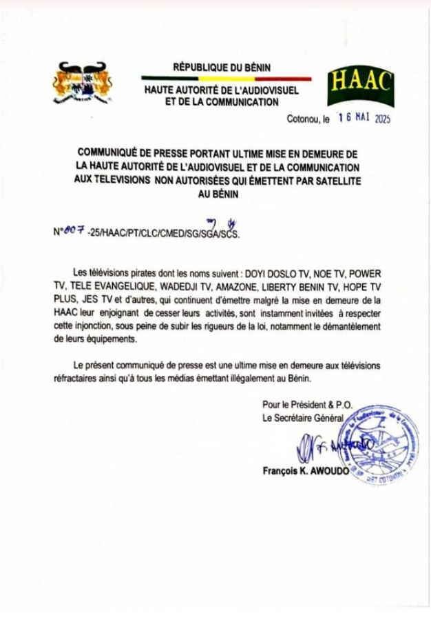 Malgré une première mise en demeure restée sans suite, la Haac revient à la charge. Le secrétaire général de l’institution rappelle que ces télévisions opèrent en dehors du cadre légal fixé par les textes régissant l’audiovisuel au Bénin. « Les chaînes concernées sont invitées à cesser toute émission, sous peine de subir les rigueurs de la loi », peut-on lire dans le communiqué.