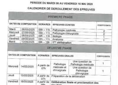 Les candidats sélectionnés sont appelés à participer aux différentes épreuves écrites qui se tiendront à la Faculté des sciences de la santé à Cotonou. Le calendrier des examens est le suivant :