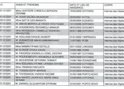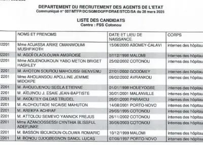 Le ministère du Travail et de la Fonction publique a officiellement publié, ce vendredi 2 mai, la liste définitive des candidats retenus pour le concours de recrutement de 30 internes des hôpitaux, en qualité d’élèves fonctionnaires de l’État. Cette annonce marque une étape cruciale dans le processus de renforcement du personnel médical au Bénin.