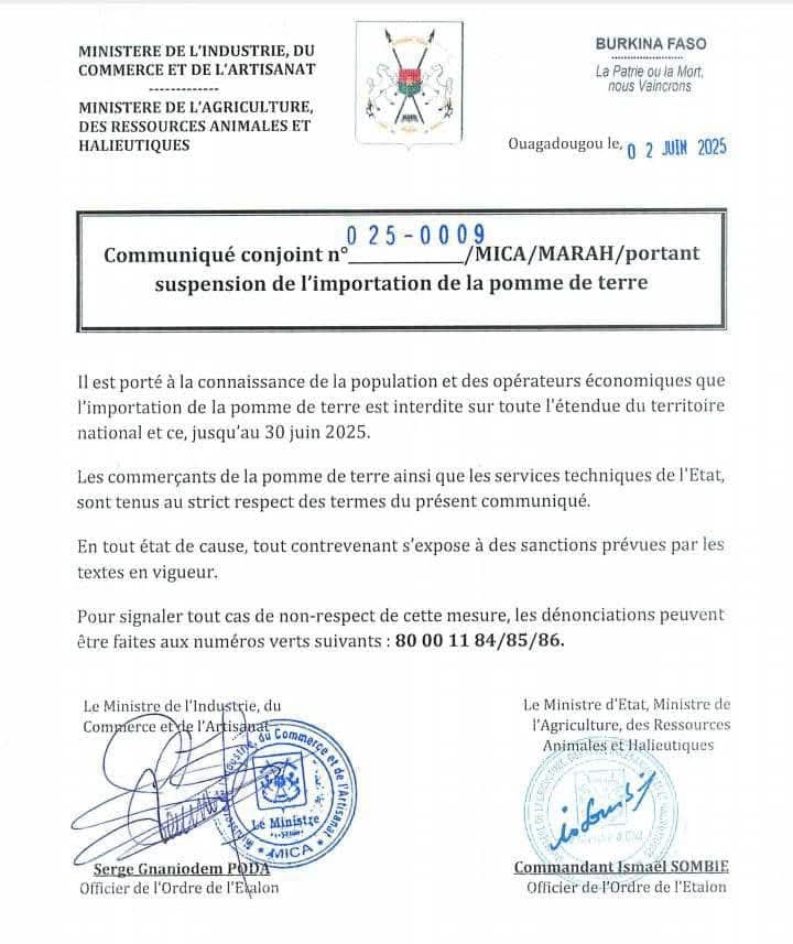 Le gouvernement burkinabè a annoncé, ce lundi 2 juin, la suspension de l’importation de la pomme de terre sur l’ensemble du territoire national. La décision, prise conjointement par le ministère du Commerce et celui de l’Agriculture, est effective jusqu’au 30 juin 2025, selon un communiqué officiel parvenu à notre rédaction.