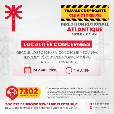 La Société Béninoise d’Énergie Électrique (SBEE) a annoncé une coupure d’électricité prévue pour le jeudi 24 avril 2025, touchant plusieurs localités à travers le pays. Cette interruption est essentielle pour permettre la réalisation de travaux d’entretien sur le réseau électrique, visant à améliorer la fiabilité et la sécurité du service.