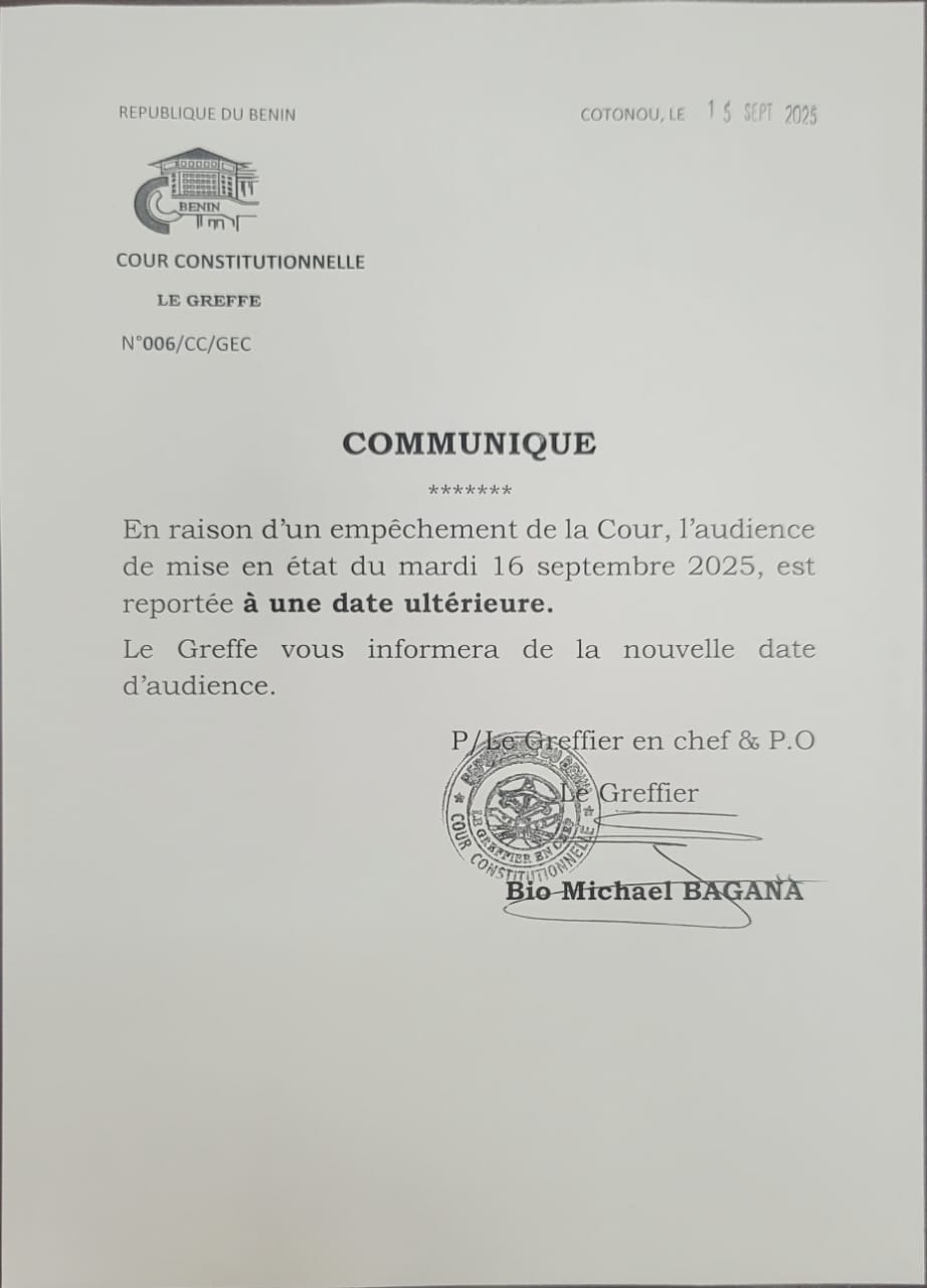 Réunie en séminaire à Grand-Popo dans le cadre des préparatifs des élections générales de 2026, la Cour constitutionnelle informe le public que l’audience de mise en état initialement prévue pour ce mardi 16 septembre 2025 à 10 heures est reportée à une date ultérieure.