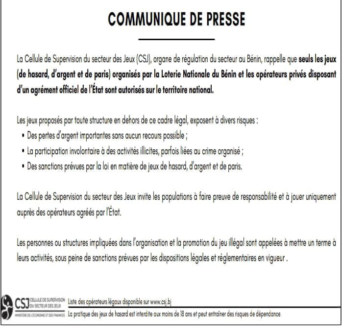 La Cellule de supervision des jeux (CSJ) hausse le ton. Dans un communiqué publié récemment, elle rappelle que seuls les jeux de hasard, d’argent et de paris autorisés par la Loterie nationale du Bénin (LNB) ou organisés par des opérateurs titulaires d’un agrément officiel sont légalement reconnus sur le territoire national.
