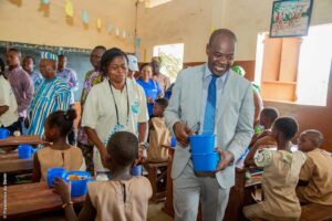 Le maire d’Abomey-Calavi, Angelo AHOUANDJINOU, a souligné l’importance de l’alimentation scolaire en tant qu’instrument de paix, permettant aux enfants d’accéder à l’éducation et de rester à l’école. Dans le cadre de cet engagement, la mairie d’Abomey-Calavi a distribué des kits de couverts en plastique, comprenant des assiettes et des gobelets, à tous les élèves des 76 écoles disposant de cantines scolaires. Cette initiative a été rendue possible grâce à la mobilisation de fonds, y compris un téléthon organisé en 2022, qui a permis de récolter plus de 22 millions de francs en soutien au PNASI.