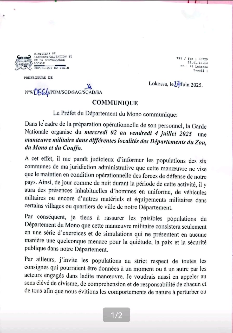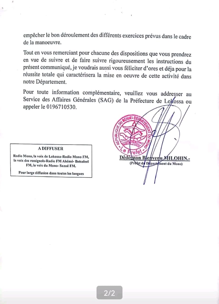 Le préfet du département du Mono, Dêdêgnon Bienvenu Milôhin, a tenu à informer les populations des six communes relevant de sa juridiction qu’une importante manœuvre militaire se déroulera prochainement dans la région.