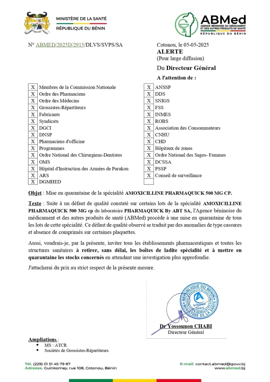 Des contrôles renforcés ont été engagés sur l’ensemble des médicaments en circulation au Bénin, et l’ABMed appelle la population à la vigilance. Toute personne en possession de ces produits ou suspectant un défaut est invitée à en informer sans délai les autorités sanitaires.